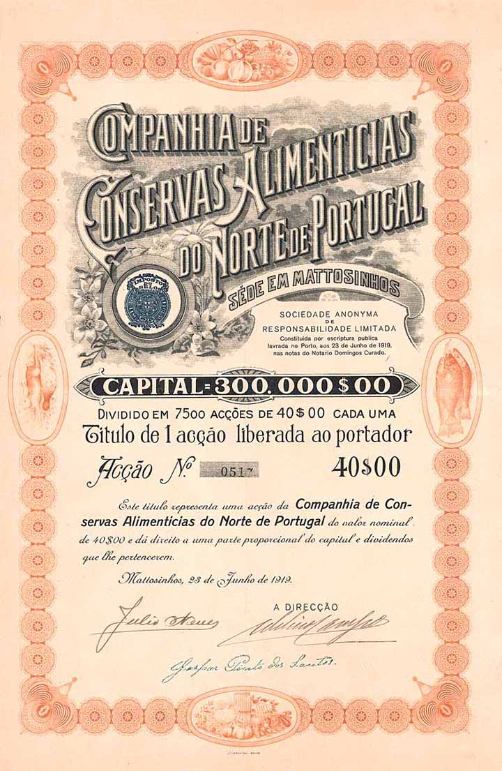 | Vorheriges Los | Zurück | Nächstes Los | | Losnr.: | 642 (Sammlung „Historische Wertpapiere aus aller Welt") | | Titel: | Cia. de Conservas Alimenticias de Norte de Portugal | | Auflistung: | Accao 40$00 23.6.1919. Gründeraktie. | | Ausruf: | 10,00 EUR | Ausgabe- datum: | 23.06.1919 | Ausgabe- ort: | Mattosinhos | | Abbildung: |  | | Stücknr.: | 515 | | Info: | Die 1919 gegründete Gesellschaft stellte Fisch-, Fleisch-, Obst- und andere Konserven her. | | Besonder-heiten: | Herrliche Gestaltung mit Hasen und Ente (für Pasteten), Fischen und Obst in der Umrandung. | | Verfügbar: | Kupons anhängend. Kleine Randverletzungen. | | Erhaltung: | EF-VF | | Zuschlag: | offen |