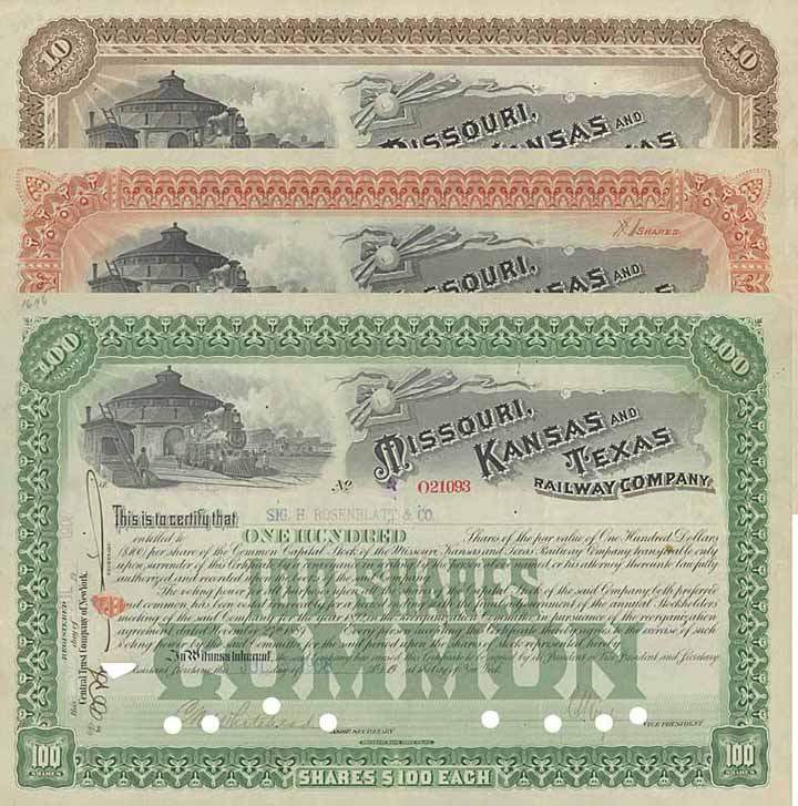| Vorheriges Los | Zurück | Nächstes Los | | Losnr.: | 701 (Sammlung „Historische Wertpapiere aus aller Welt") | | Titel: | Missouri, Kansas & Texas Railway (3 Stücke) | | Auflistung: | 10 shares à 100 $ 20.5.1909, #108673; 100 shares à 100 $ 30.7.1908, #21093; 1 share à 100 $ 5.4.1907, #11433. | | Ausruf: | 10,00 EUR | | Abbildung: |  | | Info: | Gründung 1870 durch Fusion der Union Pacific, Southern Branch (gegründet 1865, hatte zunächst nicht das geringste mit der „anderen“ Union Pacific zu tun) mit drei weiteren Bahnen. Die bedeutende Bahn, im Volksmund “Katy” genannt, geriet 1880 unter die Kontrolle des berüchtigten Jay Gould und wurde von ihm bis 1888 finanziell bis zum Bankrott ausgeplündert. 1891 übernahm eine Gruppe unter der Leitung von John D. Rockefeller die „Katy“ und baute sie innerhalb kurzer Zeit zu einer der führenden Eisenbahngesellschaften im Süden der USA aus. Das fast 2.200 Meilen lange System erstreckte sich von St. Louis und Kansas City im Norden bis nach Houston und Galveston im Süden, die Hauptstrecke verlief von St. Louis und Omaha über Dallas nach San Antonio und Galveston. Bis 1988 (!) eigenständig geblieben, dann mit der Missouri Pacific fusioniert, heute Teil der Union Pacific. | | Besonder-heiten: | Sehr dekorative Vignette mit Dampfloks und Lokschuppen, jeweils andersfarbiger Druck. Originalsignaturen (lochentwertet). | | Erhaltung: | EF-VF | | Zuschlag: | 10,00 EUR |
