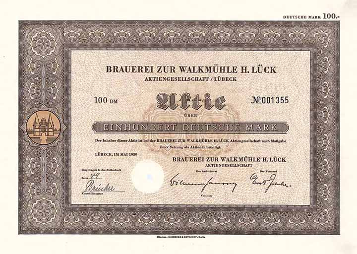 | Vorheriges Los | Zurück | Nächstes Los | | Losnr.: | 344 (Deutschland nach 1945) | | Titel: | Brauerei zur Walkmühle H. Lück AG | | Auflistung: | Aktie 100 DM Mai 1950 (Auflage 200, R 8). | | Ausruf: | 50,00 EUR | Ausgabe- datum: | 01.05.1950 | Ausgabe- ort: | Lübeck | | Abbildung: |  | | Stücknr.: | 1319 | | Info: | Gründung 1846, AG seit 1925. Spezialitäten: Lück-Spezial und Kapuziner Bräu. Später auch Herstellung von Sinalco in Lizenz. Übernommen wurden 1931 die Aktienbrauerei Lübeck, 1950 die Brauerei Hermann Stamer, 1952 die Hansa-Brauerei AG Lübeck und 1971 die Brauerei Hans Wilcken. 1979 verkaufte die Familie Lück ihre Aktienmehrheit an die Bavaria-St. Pauli-Brauerei AG, danach umgewandelt in die “Lück Brauerei zur Walkmühle GmbH”. | | Besonder-heiten: | G&D-Druck mit Vignette des Holsten-Tores. | | Verfügbar: | Lochentwertet. (R 8) | | Erhaltung: | EF | | Zuschlag: | offen |