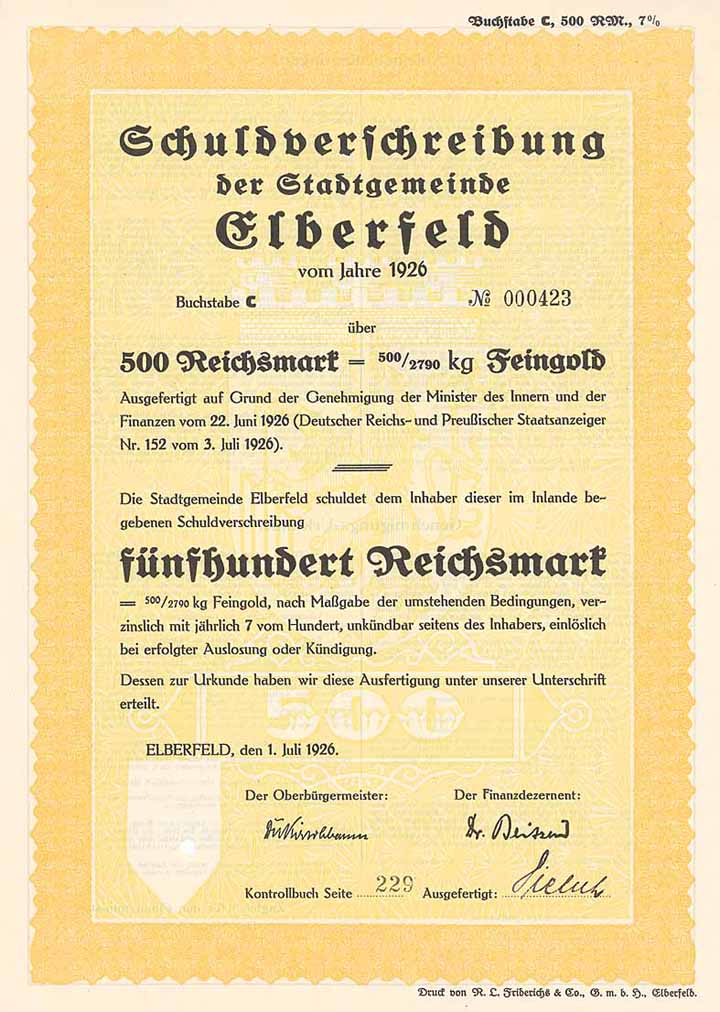 | Vorheriges Los | Zurück | Nächstes Los | | Losnr.: | 256 (Deutschland) | | Titel: | Stadt Elberfeld | | Auflistung: | 7 % Schuldv. Lit. C 500 RM 1.7.1926 (R 5). | | Ausruf: | 25,00 EUR | Ausgabe- datum: | 01.07.1926 | Ausgabe- ort: | Elberfeld | | Abbildung: |  | | Stücknr.: | 423 | | Besonder-heiten: | Lochentwertet (RB). | | Verfügbar: | Rückseitig Bedingungen und Genehmigungs-Urkunde. (R 5) | | Erhaltung: | EF+ | | Zuschlag: | offen |