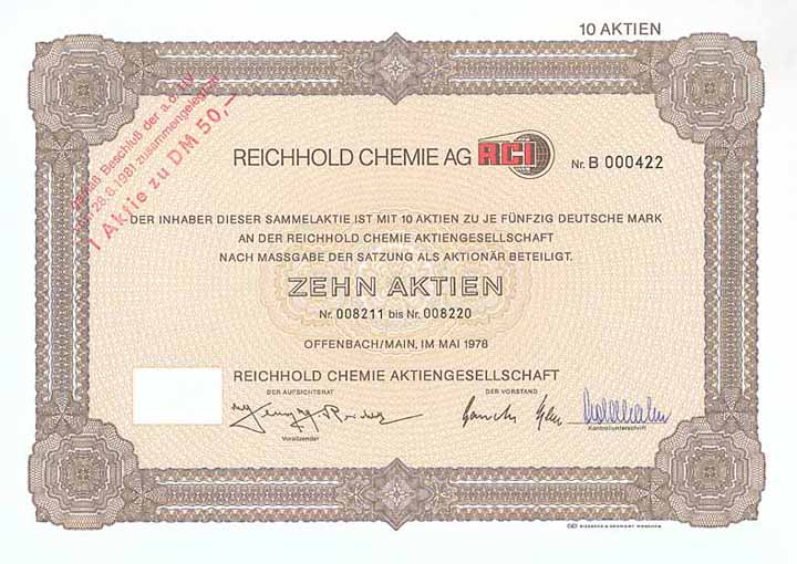 | Vorheriges Los | Zurück | Nächstes Los | | Losnr.: | 424 (Deutschland nach 1945) | | Titel: | Reichhold Chemie AG | | Auflistung: | Sammelaktie B 10 x 50 DM Mai 1978 (R 7). | | Ausruf: | 40,00 EUR | Ausgabe- datum: | 01.05.1978 | Ausgabe- ort: | Offenbach a.M. | | Abbildung: |  | | Stücknr.: | 416 | | Info: | Bei der Gründung 1903 als “Schramm'sche Lack- und Farbenfabriken vorm. Christoph Schramm u. Schramm & Hörner AG” schlossen sich die beiden bereits 1810 bzw. 1863 gegründeten Vorgängerfirmen zusammen. 1924 Umbenennung in Schramm & Megerle, Lack- und Farbenfabriken AG, 1926 in Schramm Lack- und Farbenfabriken AG, 1977 in Schramm AG. 1978 wurde das Vermögen der Reichhold Chemie GmbH auf die Schramm AG übertragen, gleichzeitig Umbenennung in Reichhold Chemie AG. 1982 Auflösungsbeschluss, 1984 Fortsetzung unter der Firma Beta Systems Computer AG und Sitzverlegung nach Mannheim, 1989 nach Frankfurt a.M., 1992 nach Kriftel. Zuletzt einer der größeren Börsen-Skandale der frühen 90er Jahre. | | Verfügbar: | Mit kpl. Kuponbogen. Unentwertet. (R 7) | | Erhaltung: | UNC-EF | | Zuschlag: | offen |