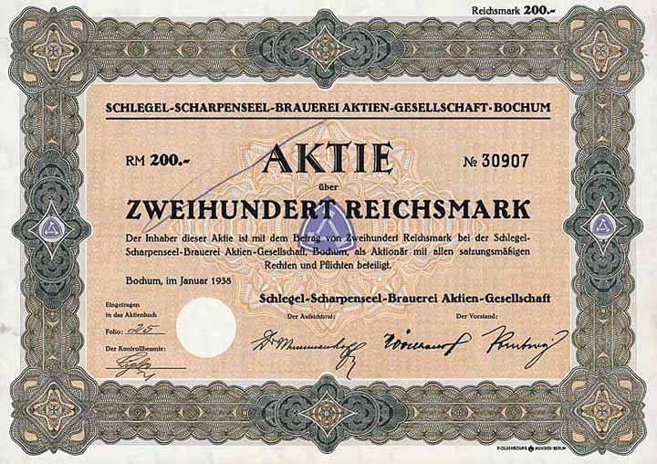 | Vorheriges Los | Zurück | Nächstes Los | | Losnr.: | 304 (Deutschland) | | Titel: | Schlegel-Scharpenseel-Brauerei AG | | Auflistung: | Aktie 200 RM Jan. 1938 (Auflage 5000). | | Ausruf: | 80,00 EUR | Ausgabe- datum: | 01.01.1938 | Ausgabe- ort: | Bochum | | Abbildung: |  | | Stücknr.: | 31000 | | Info: | 1854 machte sich Joachim Schlegel mit einer Brauerei nach bayerischer Art selbständig. Seit 1899 AG als “Schlegel-Brauerei AG”, 1918 Verschmelzung mit der “Bochumer Bierbrauerei Moritz Scharpenseel AG”. 1921 Angliederung der Recklinghäuser Brauerei AG und der Malzfabrik Hopfenberg, Giersleben i. Anhalt. 1922 Ankauf der Brauerei Arnold Fiege, Bochum und der Ruhrtal-Brauerei Brinkmann, Herbede. 1927 Verschmelzung mit der Bürgerliches Brauhaus AG, Herne. 1928 Übernahme der Victoria-Brauerei, Bochum. 1931 Erwerb der Aktienmehrheit der Bürgerliches Brauhaus AG Duisburg. Zuletzt in Betrieb die Braustätte Bochum mit 250.000 hl Jahreskapazität und die Brauerei Recklinghausen (100.000 hl). Börsennotiz in Berlin und Düsseldorf. 1971 als eine der Betriebsführungsgesellschaften der Dortmunder Union-Schultheiss Brauerei in eine GmbH umgewandelt. | | Verfügbar: | Mit Kupons. Unentwertet. (R 10) | | Erhaltung: | EF-VF | | Zuschlag: | offen |