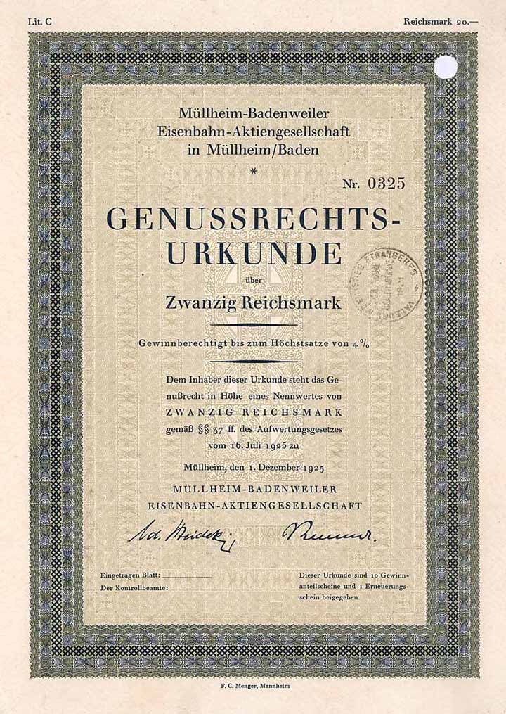 | Vorheriges Los | Zurück | Nächstes Los | | Losnr.: | 601 (Sammlung Eisenbahnen Deutschland) | | Titel: | Müllheim-Badenweiler Eisenbahn-AG | | Auflistung: | Genussrechts-Urkunde 20 RM 1.12.1925 (R 9). | | Ausruf: | 60,00 EUR | Ausgabe- datum: | 01.12.1925 | Ausgabe- ort: | Müllheim i.B. | | Abbildung: |  | | Stücknr.: | 325 | | Info: | Gegründet 1894 durch den Bahnkonzern Vering & Waechter zum Bau und Betrieb der 7,6 km langen 1000-mm-Schmalspurbahn als Verbindung vom Staatsbahnhof Müllheim zu dem Kurort Badenweiler in Baden. Anschließend ging die Betriebsführung an die Deutsche Eisenbahn-Betriebs-Gesellschaft. 1913/14 Elektrifizierung der Strecke, zugleich Übernahme der Betriebsführung in Eigenregie. Das Passagieraufkommen stieg über die Jahre ständig an bis auf 700.000 Fahrgäste im Jahr 1953. Trotzdem wurde die Bahn am 22.5.1955 stillgelegt, nachdem sie nur zwei Monate zuvor auf die Mittelbadische Eisenbahnen AG, Lahr übergegangen war. | | Besonder-heiten: | Lochentwertet (RB). | | Verfügbar: | Nur ein Stück lag im Reichsbankschatz. (R 9) | | Erhaltung: | EF | | Zuschlag: | offen |