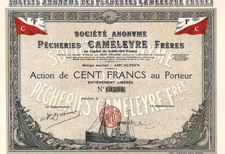 | Vorheriges Los | Zurück | Nächstes Los | | Losnr.: | 873 (Sammlung Frankreich - 10 Euro Ausruf) | | Titel: | S.A. des Pêcheries Cameleyre Frères | | Auflistung: | Action 100 F ca. 1929 (Teilblankette). | | Ausruf: | 10,00 EUR | Ausgabe- datum: | 01.01.1929 | Ausgabe- ort: | Arcachon | | Abbildung: |  | | Stücknr.: | 5781 | | Info: | Die 1924 gegründete Gesellschaft betrieb Fischfang im Golf von Biscaya. | | Besonder-heiten: | Herrliche Umrahmung mit farbigen Reedereiflaggen, Netzen, Fischen, Rettungsringen und Ansicht eines Fischkutters. | | Verfügbar: | Kupons kpl. anhängend. | | Erhaltung: | EF | | Zuschlag: | 40,00 EUR |