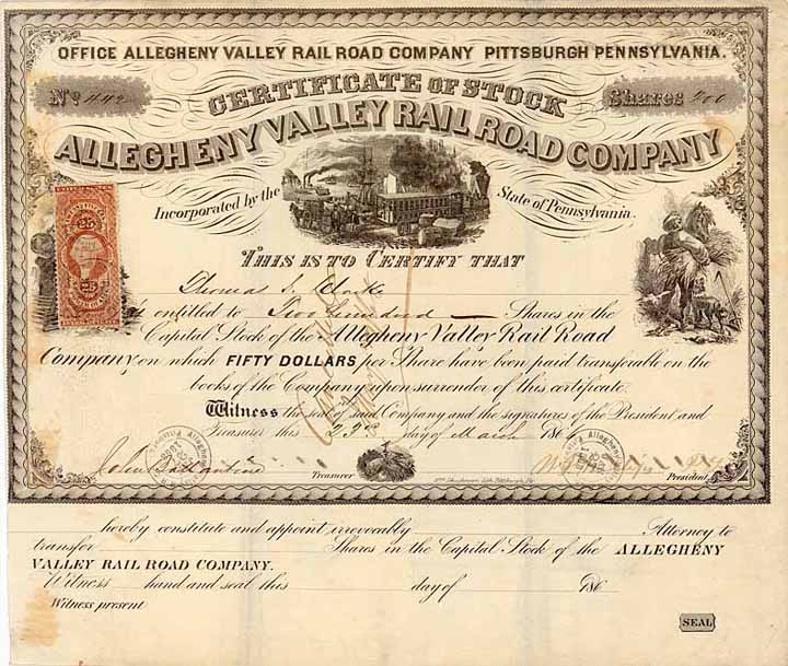 | Vorheriges Los | Zurück | Nächstes Los | | Losnr.: | 1102 (USA) | | Titel: | Allegheny Valley Railroad | | Auflistung: | 200 shares à 50 $ 23.3.1866 (auf Vordruck 186__). | | Ausruf: | 60,00 EUR | Ausgabe- datum: | 20.07.1866 | Ausgabe- ort: | Pittsburgh, Pennsylvania | | Abbildung: |  | | Stücknr.: | 442 | | Info: | Gründung 1851, bedeutende Eisenbahn von Pittsburg bis Kittaning (eröffnet 1856) und nach dem ungeheuren Ölboom im Venango County in Pennsylvania verlängert bis Oil City (eröffnet 1865). Hauptstrecke 132 Meilen, dazu 128 Meilen Flügelbahnen sowie diverse Kohlenbahnen. Später von der Pennsylvania RR übernommen. | | Besonder-heiten: | Dekorativ, mit vier schönen Vignetten. | | Verfügbar: | Andere Gestaltung als voriges Los! | | Erhaltung: | VF. | | Zuschlag: | 60,00 EUR |