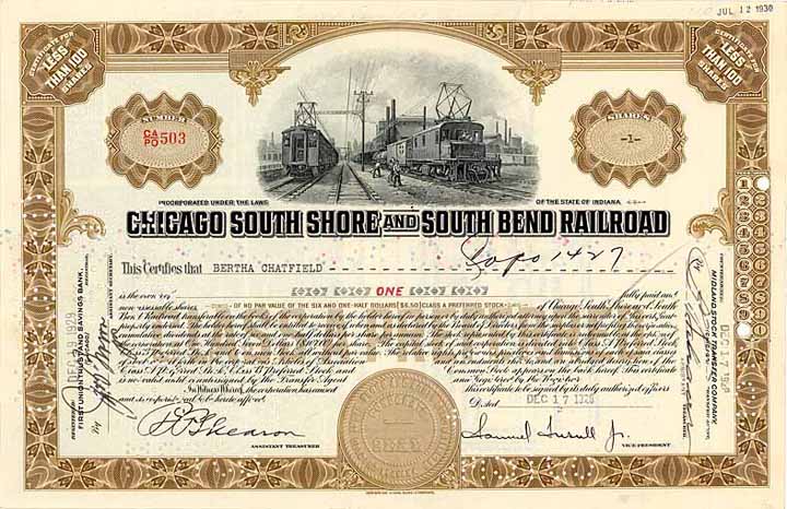 | Vorheriges Los | Zurück | Nächstes Los | | Losnr.: | 1165 (USA) | | Titel: | Chicago South Shore & South Bend Railroad | | Auflistung: | 1 Class A pref. share with no par value 12.12.1929. | | Ausruf: | 20,00 EUR | Ausgabe- datum: | 13.02.1929 | Ausgabe- ort: | Indiana | | Abbildung: |  | | Stücknr.: | CA/PO503 | | Info: | Ursprünglich 1901 als Chicago & Indiana Air Line Rw gegründet, 1904 reorganisiert als Chicago, Lake Shore & South Bend Rw. Name wie oben seit 1928. Initiator dieser letzten Reorganisation war Samuel Insull (1859-1938, geboren in London, ging 1881 in die USA und wurde Privatsekretär von Thomas A. Edison, 1889 an der Gründung von Edison General Electric beteiligt, 1892 ging er als Chef der Chicago Edison Co. nach Chicago und baute dort ein gewaltiges Imperium von Elektrizitätsversorgern und Straßenbahngesellschaften auf, das in der Krise 1929 krachend zusammenbrach. Zweck dieser Gesellschaft war der Betrieb von Vorortbahnen in die südlichen Vorstädte, die sich am Ufer des Michigansees entlangziehen. Anfangs ausschließlich Personenverkehr, seit 1990 nur noch Frachtverkehr (überwiegend Kohle und Stahlprodukte). Die Bahn ging mehrfach bankrott, bis sie schließlich bei der Anacostia & Pacific Co. unterkam und sich nunmehr einer guten Auslastung erfreut. | | Besonder-heiten: | Mit Faksimileunterschrift Samuel Insull. Braun/schwarzer ABNC-Stahlstich, eindrucksvolle große Vignette mit Vorortzug und Güterzug auf viergleisiger Strecke. | | Verfügbar: | Diese braune Version hatten wir noch nie auf der Auktion! | | Erhaltung: | EF. | | Zuschlag: | offen |