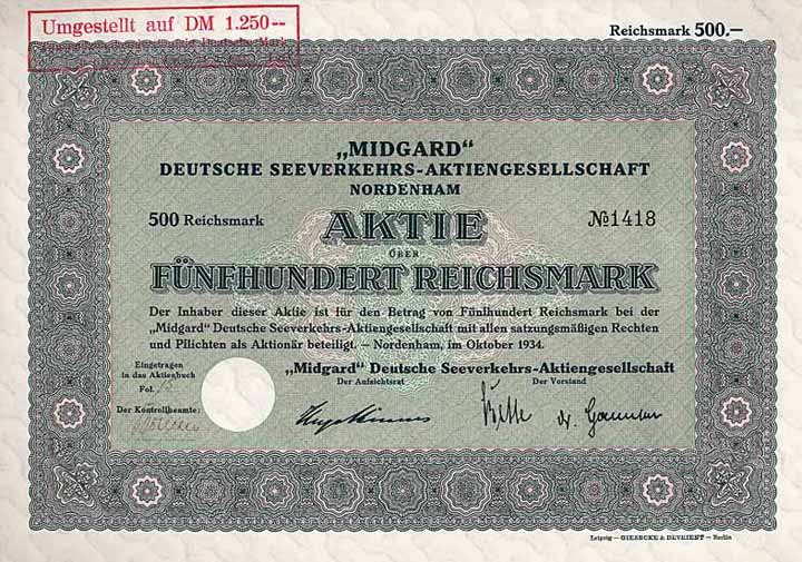 | Vorheriges Los | Zurück | Nächstes Los | | Losnr.: | 276 (Deutschland) | | Titel: | MIDGARD Deutsche Seeverkehrs-AG | | Auflistung: | Aktie 500 RM Okt. 1934 (Auflage 1000, R 7). | | Ausruf: | 25,00 EUR | Ausgabe- datum: | 01.10.1934 | Ausgabe- ort: | Nordenham | | Abbildung: |  | | Stücknr.: | 1379 | | Info: | Gründung 1905 zum Betrieb des Hafens von Nordenham, einer Reederei und einer Heringsfischerei. 1928 umbenannt in “Midgard” Deutsche Seeverkehrs- und Heringsfischerei AG (Umfirmierung 1931 rückgängig gemacht). 1967/68 Ausbau des Seehafens, der nun über 1.100 m Kailänge mit Verladebrücken und Kränen verfügte sowie landseitig einen 50.000 t fassenden Getreidesilo mit 3 Getreidehebern, 6 Öltanks mit 35.000 cbm Fassungsvermögen und eigene Gleisanlagen. Beschäftigt wurden in der Spitze fast 1.000 Mitarbeiter. Alleinaktionär war die dann zum VEBA-Konzern gehörende Hugo Stinnes AG. 1971 Neugründung unter gleichem Namen. | | Besonder-heiten: | 1951 umgestempelt auf 1.250 DM. Faksimile-Unterschrift von Hugo Stinnes als AR-Vorsitzender. | | Verfügbar: | R 7 | | Erhaltung: | EF | | Zuschlag: | offen |