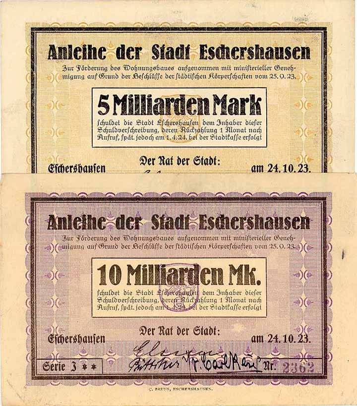 | Vorheriges Los | Zurück | Nächstes Los | | Losnr.: | 447 (Deutschland) | | Titel: | Stadt Eschershausen i. Brschw. (2 Stücke) | | Auflistung: | Schuldv. 5 Milliarden Mark und 10 Milliarden Mark 24.10.1923. | | Ausruf: | 40,00 EUR | Ausgabe- datum: | 24.10.1923 | Ausgabe- ort: | Eschershausen i. Brschw. | | Abbildung: |  | | Info: | Die Stadt Eschershausen gehörte bis zu ihrer Auflösung zum Freistaat Braunschweig. | | Besonder-heiten: | Kleinformatig. | | Verfügbar: | Lediglich ca. 14,5 x 9,5 cm groß. | | Erhaltung: | VF+ | | Zuschlag: | offen |