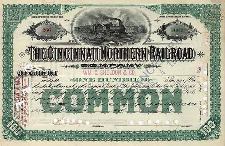 | Vorheriges Los | Zurück | Nächstes Los | | Losnr.: | 1166 (USA) | | Titel: | Cincinnati Northern Railroad | | Auflistung: | 100 shares à 100 $ 7.2.1902. | | Ausruf: | 30,00 EUR | Ausgabe- datum: | 07.02.1902 | Ausgabe- ort: | Ohio | | Abbildung: |  | | Stücknr.: | 269 | | Info: | Gründung 1897 zur Übernahme der Ohio Division der Cincinnati, Jackson & Mackinaw Ry. Hauptstrecke von Franklin Junc., O. nach Jackson, Mich. (205 Meilen). 1901 übernahm die Cleveland, Cincinnati, Chicago & St. Louis Ry. die Aktienmehrheit und die Betriebsführung, damit zuletzt Teil des mächtigen New-York-Central-Systems. | | Besonder-heiten: | Grün/schwarzer Stahlstich mit unheimlich feiner Personenzug-Vignette. | | Erhaltung: | VF+ | | Zuschlag: | 30,00 EUR |