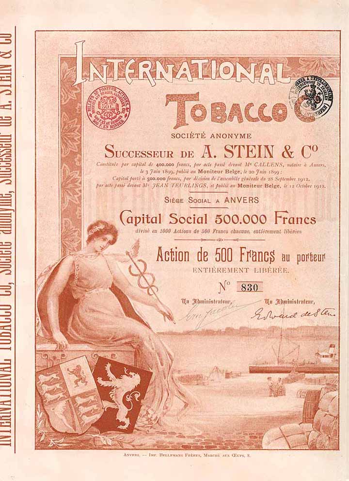 | Vorheriges Los | Zurück | Nächstes Los | | Losnr.: | 18 (Belgien) | | Titel: | International Tobacco Co. | | Auflistung: | Action 500 Fr. von 1912 (Auflage 200). | | Ausruf: | 60,00 EUR | Ausgabe- datum: | 01.01.1912 | Ausgabe- ort: | Antwerpen | | Abbildung: |  | | Stücknr.: | 659 | | Info: | Tabakimporteur, gegründet 1899 nach Übernahme der Handelsfirma A. Stein & Co. | | Besonder-heiten: | Hochdekoratives Papier mit weiblicher Allegorie des Handels, unten zwei Wappen, zu ihren Füssen Hafenszene mit Dockarbeitern beim Entladen eines Frachters. | | Verfügbar: | Kleine Einrisse am rechten Rand mit Tesaband hinterklebt. Mit beiliegendem restlichen Kuponbogen. Eine der schönsten belgischen Aktien überhaupt. | | Erhaltung: | VF | | Zuschlag: | offen |