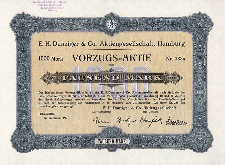 | Vorheriges Los | Zurück | Nächstes Los | | Losnr.: | 100 (Deutschland) | | Titel: | E. H. Danziger & Co. AG | | Auflistung: | VZ-Aktie 1.000 Mark Dez. 1921. Gründeraktie (Auflage 1000, R 9). | | Ausruf: | 50,00 EUR | Ausgabe- datum: | 01.12.1921 | Ausgabe- ort: | Hamburg | | Abbildung: |  | | Stücknr.: | 880 | | Info: | Gründung am 15.12.1921 durch Hamburger Kaufleute und Bankiers zwecks Export und Import von Waren aller Art, Durchführung von Kommissionsgeschäften in Waren aller Art sowie Durchführung aller mit der Industrie und Finanz verknüpften Transaktionen, wie auch der damit in Zusammenhang stehenden Geschäfte banktechnischer Art. Am 22.6.1926 von Amts wegen gelöscht. | | Verfügbar: | R 9 | | Erhaltung: | EF- | | Zuschlag: | offen |