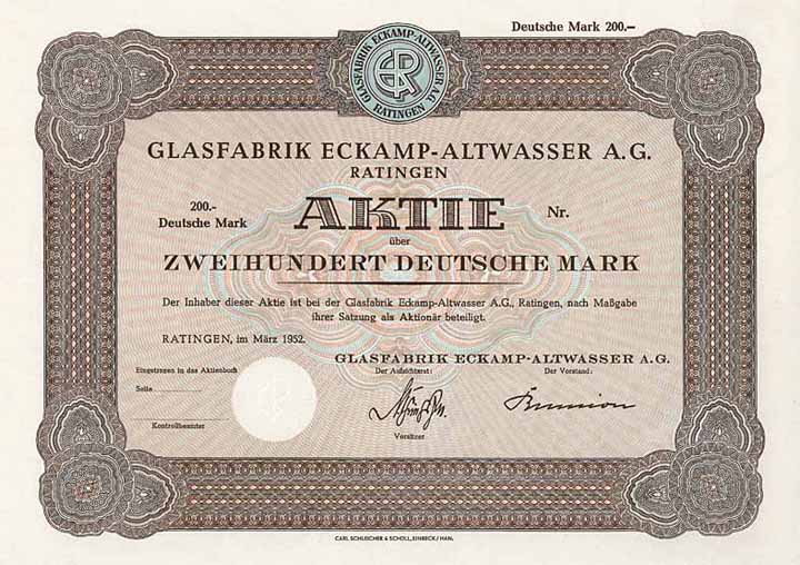 | Vorheriges Los | Zurück | Nächstes Los | | Losnr.: | 395 (Deutschland nach 1945) | | Titel: | Glasfabrik Eckamp-Altwasser AG | | Auflistung: | Aktie 200 DM März 1952 (Blankette). | | Ausruf: | 30,00 EUR | Ausgabe- datum: | 01.03.1952 | Ausgabe- ort: | Ratingen | | Abbildung: |  | | Info: | Gründung 1889 als "Rheinische Spiegelglasfabrik". 1950 Fusion mit der Schlesische Spiegelglas-Manufaktur Carl Tielsch GmbH, Aachen (früher Altwasser O.S.) und Umfirmierung wie oben. Großaktionäre waren die Vereinigte Glaswerke Aachen (die ihren Anteil immer weiter ausbauten) und der französische Glaskonzern St. Gobain (der seine Anteile Anfang der 60er Jahre verkaufte). 1965 in eine GmbH umgewandelt. | | Verfügbar: | Unentwertet. Mit kpl. Kuponbogen. Zuletzt 2014 bei uns in einer Auktion gewesen. | | Erhaltung: | UNC | | Zuschlag: | offen |