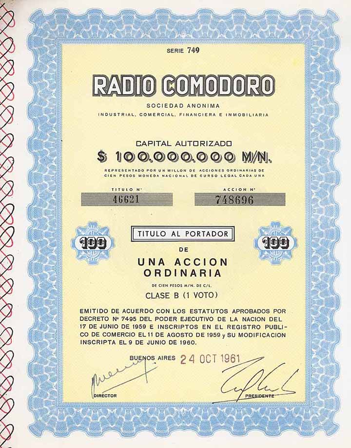 | Vorheriges Los | Zurück | Nächstes Los | | Losnr.: | 9 (Argentinien) | | Titel: | Radio Comodoro S.A. | | Auflistung: | Accion Clase “B” 100 Pesos 24.10.1961. | | Ausruf: | 25,00 EUR | Ausgabe- datum: | 24.10.1961 | Ausgabe- ort: | Buenos Aires | | Abbildung: |  | | Stücknr.: | 46601 | | Info: | Gegründet 1959 (im gleichen Jahr wurde in Argentinien unter dem neu gewählten Präsidenten Arturo Frondizi die Kommunistische Partei verboten), damals der größte private Rundfunksender in Argentinien. | | Verfügbar: | Nur 3 Stück wurden gefunden. Mit anh. Kuponbogen. | | Erhaltung: | EF | | Zuschlag: | offen |