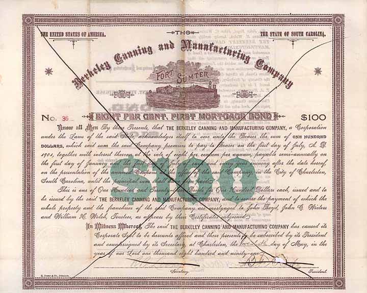 | Vorheriges Los | Zurück | Nächstes Los | | Losnr.: | 1046 (USA) | | Titel: | Berkeley Canning and Manufacturing Co. | | Auflistung: | 8 % Bond 100 $ 20.5.1891 (Auflage 123). | | Ausruf: | 30,00 EUR | Ausgabe- datum: | 20.05.1891 | Ausgabe- ort: | Charleston, South Carolina | | Abbildung: |  | | Stücknr.: | 55 | | Info: | Berkeley County umfaßt Charleston, die Hauptstadt von South Carolina, und ihre Umgebung. | | Besonder-heiten: | Großformatig, mit eindrucksvoller Vignette des im Charleston River gelegenen Fort Sumter, mit dessen Beschießung durch konföderierte Truppen am 12.4.1861 der Sezessionskrieg begann. | | Verfügbar: | Mit anh. Kuponbogen. | | Erhaltung: | VF | | Zuschlag: | offen |