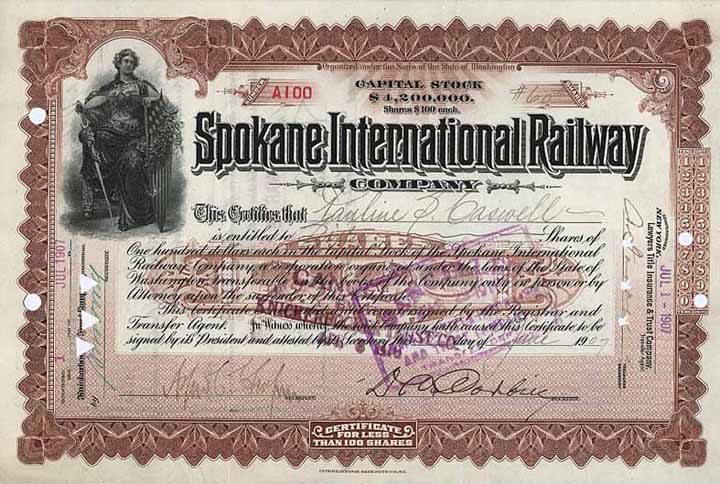 | Vorheriges Los | Zurück | Nächstes Los | | Losnr.: | 870 (USA) | | Titel: | Spokane International Railway | | Auflistung: | 40 shares à 100 $ 28.10.1908. | | Ausruf: | 50,00 EUR | Ausgabe- datum: | 29.10.1909 | Ausgabe- ort: | Washington | | Abbildung: |  | | Stücknr.: | A121 | | Info: | Konzessioniert 1905 zum Bau der Eisenbahn von Spokane, Wash. nach Eastport, Idaho (141 Meilen). Es bestanden (deshalb auch der Zusatz “International”) Anschlüsse an die Canadian Pacific & Oregon Ry. und die Navigation Ry. | | Erhaltung: | VF | | Zuschlag: | 60,00 EUR |