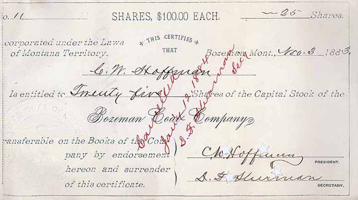 | Vorheriges Los | Zurück | Nächstes Los | | Losnr.: | 758 (USA) | | Titel: | Bozeman Coal Co. | | Auflistung: | 900 shares à 100 $ 12.5.1889. | | Ausruf: | 30,00 EUR | Ausgabe- datum: | 03.11.1883 | Ausgabe- ort: | Bozeman, Montana | | Abbildung: |  | | Stücknr.: | 47 | | Info: | Gegründet 1883 zur Erschließung von Kohlelagerstätten an der Hauptstrecke der Northern Pacific Railroad nordnordwestlich vom Yellowstone National Park. | | Besonder-heiten: | Kleinformatig. Schmucklos. | | Verfügbar: | Aus dem Archiv der Northern Pacific. Selten. Vollständiger Stub linksseitig aufgeleimt. | | Erhaltung: | EF | | Zuschlag: | 36,00 EUR |