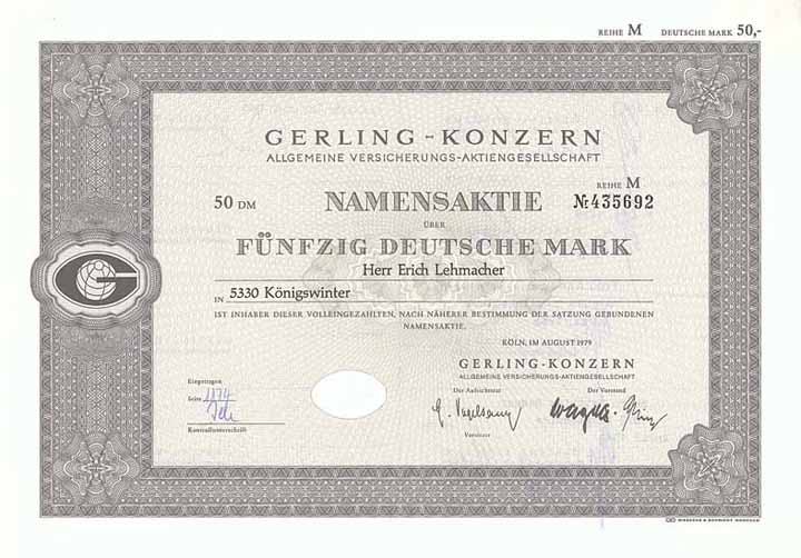 | Vorheriges Los | Zurück | Nächstes Los | | Losnr.: | 259 (Deutschland) | | Titel: | GERLING-KONZERN Allgemeine Versicherungs-AG | | Auflistung: | Namensaktie Reihe M 50 DM Aug. 1979 (R 8). | | Ausruf: | 60,00 EUR | Ausgabe- datum: | 01.08.1979 | Ausgabe- ort: | Köln | | Abbildung: |  | | Stücknr.: | 432192 | | Info: | Gründung 1918 als Allgemeine Versicherungs-AG, 1923 wurde dem Firmennamen “Gerling-Konzern” vorangestellt. Im Aufsichtsrat saß seinerzeit alles, was in der rheinischen Wirtschaft Rang und Namen hatte: Abs sen., Clouth, Duisberg, Guilleaume, Hoesch, Mannesmann, Quandt, Schoeller etc. 1936 wurden weitere 18 bis dahin im Gerling-Konzern selbständig arbeitende Versicherungsgesellschaften durch Fusion übernommen. Das Engagement der Firmenpatriarchen Hans Gerling bei der 1974 zusammengebrochenen Herstatt-Bank brachte den damals zweitgrößten deutschen Industrieversicherer ins Wanken. Gerling musste notgedrungen die Zürich Versicherungsgesellschaft in der Schweiz als Anteilseigner mit ins Boot nehmen (übrigens nicht ohne einen netten Profit, der über ein karibisches Steuerparadies abgewickelt wurde), kaufte diese Anteile später aber wieder zurück. Die Deutsche Bank stieg Ende der 80er Jahre bei der Gerling-Konzern Versicherungsbeteiligungs-AG mit 30% ein, um später - reumütig und wohl kaum mit viel Gewinn - dort wieder auszusteigen. Nach seinem Tod zerfiel sein Lebenswerk endgültig. 2006 wurde Gerling mit seinen weltweit über 6.000 Mitarbeitern von der Talanx-Gruppe (HDI-Konzern, Hannover) übernommen. | | Verfügbar: | Sternförmig lochentwertet. Rückseitig 6 Übertragungsvermerke. (R 8) | | Erhaltung: | EF | | Zuschlag: | 60,00 EUR |