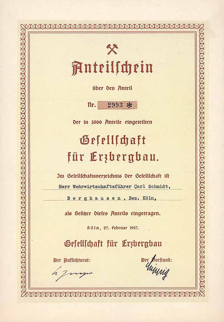 | Vorheriges Los | Zurück | Nächstes Los | | Losnr.: | 261 (Deutschland) | | Titel: | Gesellschaft für Erzbergbau | | Auflistung: | Anteilschein 27.2.1937 (Auflage 3500, R 8). | | Ausruf: | 38,00 EUR | Ausgabe- datum: | 27.02.1937 | Ausgabe- ort: | Köln | | Abbildung: |  | | Stücknr.: | 1346 | | Info: | Dieser Anteilschein hat folgenden Hintergrund: Der von Hermann Göring entworfene Vierjahresplan diente - wie die Historiker heute wissen - der Vorbereitung des zweiten Weltkrieges. Einer der Schwerpunkte dieses Planes war die Stärkung der deutschen Rohstoffbasis, die schon für eine normale Friedenswirtschaft zur damaligen Zeit längst nicht mehr ausreichte. Vor diesem Hintergrund wurden ältere Lagerstätten neu untersucht und neue, auch im Grunde minderwertige, erschlossen. Paradebeispiel war die Gründung der "Reichswerke Hermann Göring" in Salzgitter auf der Basis der "sauren" Erze mit nur 35 % Fe-Gehalt. Die Gesellschaft für Erzbergbau überprüfte im Zuge der damaligen Autarkiebestrebungen im Westerwald, der Eifel, evtl. auch im Siegerland Erzlagerstätten auf ihre Abbauwürdigkeit. | | Verfügbar: | Rückseitig Übertragungsvermerk auf Possehl Erzvertretung GmbH, Düsseldorf. Rückseitig stempelentwertet. (R 8) | | Erhaltung: | EF | | Zuschlag: | 42,00 EUR |