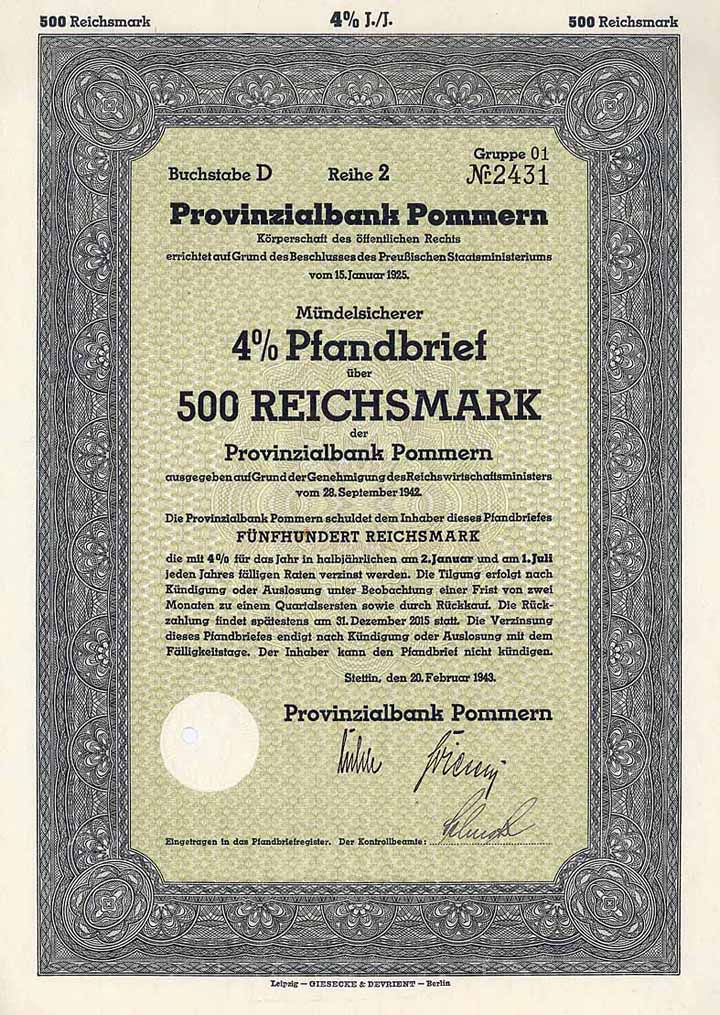 | Vorheriges Los | Zurück | Nächstes Los | | Losnr.: | 445 (Deutschland) | | Titel: | Provinzialbank Pommern | | Auflistung: | 4 % Pfandbrief 500 RM 20.2.1943 (R 2). | | Ausruf: | 20,00 EUR | Ausgabe- datum: | 20.02.1943 | Ausgabe- ort: | Stettin | | Abbildung: |  | | Stücknr.: | 2462 | | Info: | Gegründet 1924. Rechtsnachfolgerin der 1912 vom Kommunalen Giroverband Pommern gegründeten Girozentrale und der aus den 1847 gegründeten Provinzial-Hilfskassen von Altpommern, Neupommern und Rügen hervorgegangenen Provinzial-Hilfskasse von Pommern. | | Besonder-heiten: | Lochentwertet (RB). | | Verfügbar: | R 2 | | Erhaltung: | EF | | Zuschlag: | 20,00 EUR |