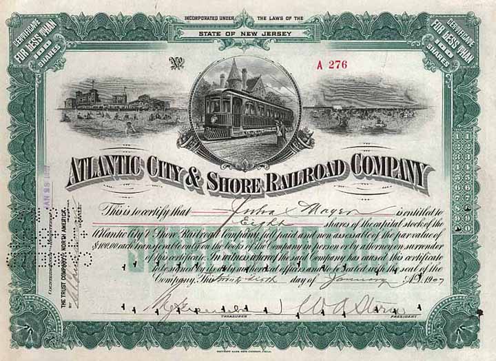 | Vorheriges Los | Zurück | Nächstes Los | | Losnr.: | 760 (USA) | | Titel: | Atlantic City & Shore Railroad | | Auflistung: | 25 shares à 100 $ 15.2.1906, ausgestellt auf die Atlantic City Construction Co. | | Ausruf: | 100,00 EUR | Ausgabe- datum: | 15.02.1906 | Ausgabe- ort: | New Jersey | | Abbildung: |  | | Stücknr.: | 65 | | Info: | Die 1905 gegründete Gesellschaft betrieb ein knapp 50 Meilen langes Straßen- und Kleinbahnnetz in und um Atlantic City sowie die 8,5 Meilen lange Straßenbahn entlang der Atlantic Avenue bis Longport, von wo es mit der Fähre weiter nach Ocean City ging. Schon damals erfreute sich das heutige Spielerparadies größter Beliebtheit als Erholungs- und Vergnügungsort: Befördert wurden bis zu 10 Mio. Fahrgäste im Jahr. | | Besonder-heiten: | Drei herrliche Stahlstich-Vignetten mit Hotels und Casinos, Strandszenen und Straßenbahn vor einem auf altertümlich gemachten Haus, in dem in Atlantic City noch heute ein Restaurant betrieben wird. | | Verfügbar: | Sehr selten. Mit Resten vom Stub. | | Erhaltung: | VF | | Zuschlag: | 110,00 EUR |