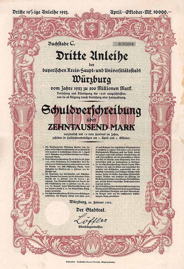 | Vorheriges Los | Zurück | Nächstes Los | | Losnr.: | 91 (Deutschland) | | Titel: | Bayerische Kreis-Haupt- und Universitätsstadt Würzburg | | Auflistung: | 10 % Schuldv. 10.000 Mark 20.2.1923 (R 10). | | Ausruf: | 100,00 EUR | Ausgabe- datum: | 20.02.1923 | | Abbildung: |  | | Stücknr.: | 11003 | | Besonder-heiten: | Teil einer Anleihe von 200 Mio. Mark. Dekorative breite Umrahmung mit Putti und Füllhörnern. | | Verfügbar: | Rückseitig Anleihebestimmungen. Mit vollständigem Kuponbogen. (R 10) | | Erhaltung: | EF-VF | | Zuschlag: | offen |