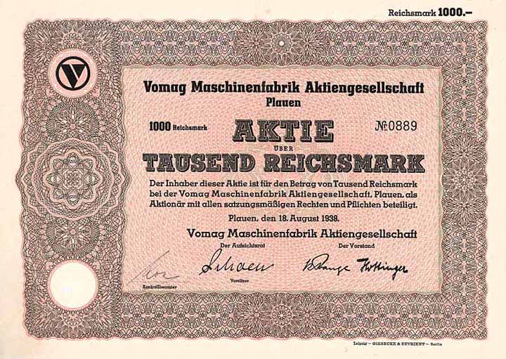 | Vorheriges Los | Zurück | Nächstes Los | | Losnr.: | 624 (Deutschland) | | Titel: | Vomag Maschinenfabrik AG | | Auflistung: | Aktie 1.000 RM 18.8.1938 (Auflage 4000, R 2, kpl. Aktienneudruck). | | Ausruf: | 20,00 EUR | Ausgabe- datum: | 18.08.1938 | Ausgabe- ort: | Plauen i.V. | | Abbildung: |  | | Stücknr.: | 2095 | | Info: | Gründung 1895 unter Übernahme der Stickmaschinen-Fabrik von J. C. & H. Dietrich. Zuerst Herstellung und Verkauf von Hand- und Schiffchen-Stickmaschinen, Vorbereitungsmaschinen für die Webereien engl. Gardinen, Widerdruckmaschinen für endloses Papier, u.a. Rotationsmaschinen für Zeitungsdruck. Ab 1916 Herstellung von Lastwagen, Benzin- u. Dieselmotoren, Spezialfahrzeugen, Wiegegeräten, Grau- u. Stahlguß. 1932 zahlungsunfähig und Konkursverfahren. Zur Weiterführung des Betriebes wurde die Vomag-Betriebs-AG als Auffanggesellschaft gegründet, 1938-1942 Vomag Maschinenfabrik AG, ab September 1942 Vomag Vogtländische Maschinenfabrik AG. Ab 1942 auch Panzermontage. Nach dem 2. WK wurde das Werk in Plauen von den Russen komplett demontiert und die VOMAG-Gebäude gesprengt. Damit endete die Geschichte der Firma, Nutzfahrzeuge wurden im Vogtland nie wieder gebaut. | | Besonder-heiten: | G & D-Druck mit Firmenlogo. Lochentwertet (RB). | | Verfügbar: | R 2 | | Erhaltung: | EF+ | | Zuschlag: | offen |