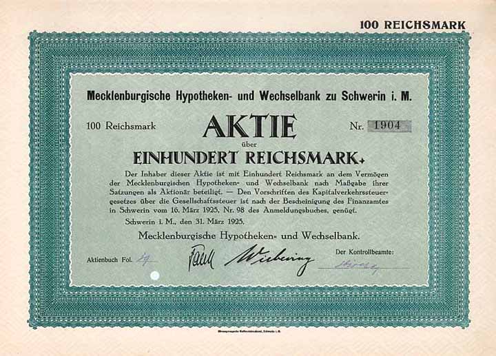 | Previous lot | Back | Next lot | | Lot: | 731 (Deutschland) | | Title: | Mecklenburgische Hypotheken- und Wechselbank | | Details: | Aktie 100 RM 31.3.1925 (Auflage 1445, R 4). | Starting price: | 50,00 EUR | Issuing- date: | 31.03.1925 | Issuing- place: | Schwerin | | Picture: |  | | Number: | 1902 | | Info: | Gründung 1871. Im Jahr 1921 Beschränkung auf das Realkredit-Geschäft, die übrigen Sparten wurden auf die Mecklenburgische Spar-Bank in Schwerin übertragen. Börsennotiz Berlin. 1963 verlagert nach Lübeck, 1964 umbenannt in Norddeutsche Hypotheken- und Wechselbank (vormals Mecklenburgische Hypotheken- und Wechselbank), Lübeck. 1965 verlagert nach Hamburg, 1980 umfirmiert in Norddeutsche Hypotheken- und Wechselbank, 2002 in der Eurohypo AG, der gemeinsamen Hypothekenbank der drei Frankfurter Großbanken, aufgegangen. | | Specials: | Lochentwertet (RB). | | Availability: | R 4 | | Condition: | EF | | Sold: | 50,00 EUR n |