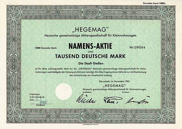 | Previous lot | Back | Next lot | | Lot: | 956 (Germany after 1945) | | Title: | „HEGEMAG“ Hessische gemeinnützige AG für Kleinwohnungen (Stadt Gießen) | | Details: | Namens-Aktie 1.000 DM Nov. 1963 (Auflage 3000, R 5), ausgestellt auf die Stadt Gießen. | Starting price: | 30,00 EUR | Issuing- date: | 01.11.1963 | Issuing- place: | Darmstadt | | Picture: |  | | Number: | 9106 | | Info: | Gründung 1927 zwecks Schaffung gesunder und zweckmäßig eingerichteter Kleinwohnungen im Sinne des Wohnungsgemeinnützigkeitsgesetzes. Bis 1931 waren in Darmstadt, Mainz, Gießen, Bingen, Worms, Neu Isenburg, Friedberg, Bad Vilbel, Ober-Ramstadt und Gernsheim insgesamt 410 Wohnungen errichtet. Rd. 20 % des Bestandes wurden im 2. Weltkrieg zerstört. Vor allem Anfang der 1950er Jahre kamen jährlich bis zu 500 Wohnungen dazu, so daß Ende der 1960er Jahre über 6.000 Wohnungen im Bestand waren, mit Schwerpunkten in Darmstadt (ca. 28 %), Gießen, (ca. 15 %), Offenbach und Neu Isenburg (je ca. 7 %) sowie Alsfeld und Lauterbach (je ca. 6 %). Vermietet wurden die Wohnungen an Beschäftigte im öffentlichen Dienst. Neben einigen hessischen Städten mit kleineren Anteilen und der Stadt Darmstadt mit über 10 % Aktienanteil hielt das Land Hessen mit über 60 % die Mehrheit, der Schwerpunkt der HEGEMAG-Aktivitäten war aber schon lange Darmstadt. Als sich das Land Hessen aus dem Wohnungsbau 2001/02 zurückziehen wollte, war es deshalb nur natürlich, daß die HEGEMAG 2003 an die Stadt Darmstadt ging und mit der stadteigenen bauverein AG (gegründet 1864 als „Bauverein für Arbeiterwohnungen“) fusioniert wurde. Heute bewirtschaftet die bauverein AG ca. 12.000 Wohnungen, davon 1/3 außerhalb von Darmstadt. 5.000 dieser Wohnungen wurden zur Finanzierung der HEGEMAG-Übernahme 2003 im Rahmen einer sale-and-lease-back-Vereinbarung an ein Bankenkonsortium verkauft. | | Availability: | Unentwertet. (R 5) | | Condition: | EF | | Sold: | unsold |