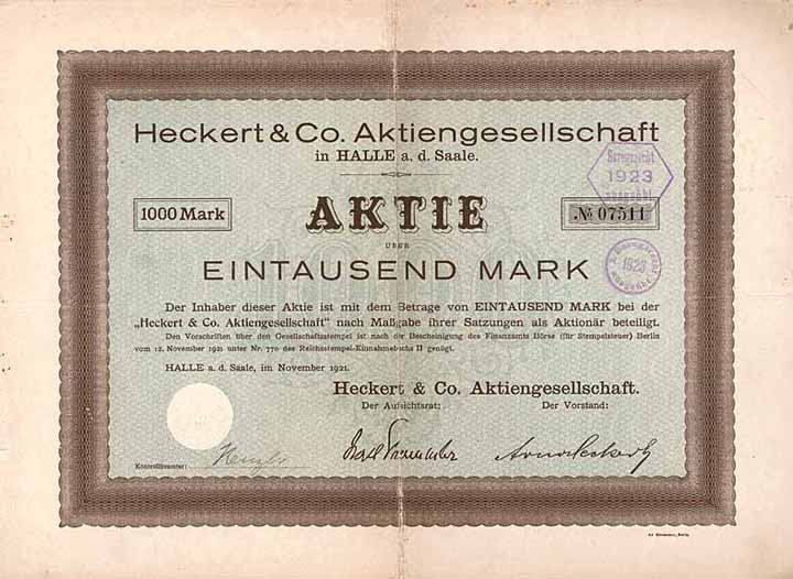 | Previous lot | Back | Next lot | | Lot: | 323 (Deutschland) | | Title: | Heckert & Co. AG | | Details: | Aktie 1.000 Mark Nov. 1921. Gründeraktie (Auflage 12000, R 10). | Starting price: | 100,00 EUR | Issuing- date: | 01.11.1921 | Issuing- place: | Halle a.d. Saale | | Picture: |  | | Number: | 7511 | | Info: | Gegründet 1921 mit Sitz in Berlin zwecks Herstellung und Großhandel sämtlicher Erzeugnissen der Glas- und Porzellanindustrie, insbesondere Pachtung sämtlicher Betriebe der Firma Heckert & Co. Glasgroßhandlung, Halle a.d.Saale. 1922 Sitzverlegung nach Halle a.d.Saale und gleichzeitig Einrichtung einer Filiale in Königsberg i.Pr. Ebenfalls 1922 kam es zu Differenzen in der Verwaltung, die in der Entlassung und kurz darauf Wiedereinstellung des Vorstands Arno Heckert gipfelten. Entsprechend sackte der Kurs der in Halle a.S. und Leipzig börsennotierten AG bis Ende 1923 auf nur noch 1,7 % des Nennwertes ab. 1924 Konkurseröffnung. | | Availability: | NICHT lochentwertet. In der Form sind seit Jahrzehnten nur zwei Stücke bekannt. (R 10) | | Condition: | VF | | Sold: | unsold |