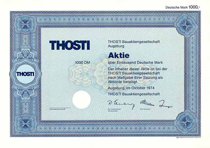 | Previous lot | Back | Next lot | | Lot: | 973 (Germany after 1945) | | Title: | THOSTI Bau-AG | | Details: | Aktie 1.000 DM Okt. 1974 (Blankette, R 9). | Starting price: | 80,00 EUR | Issuing- date: | 01.10.1974 | Issuing- place: | Augsburg | | Picture: |  | | Info: | 1876 gründen in Augsburg der Bauingenieur Alfred Thormann und der Maurermeister Tobias Schneller ein Baugeschäft für Industrie- und Wasserbauten. 1880 beteiligt sich auch der Ingenieur Jean Stiefel und setzt sich besonders für den damals neuen Baustoff Beton ein. 1883 wird eine eigene Fabrik für Betonrohre und Werksteine errichtet. 1890 baut Thosti für die Mechanische Baumwollspinnerei und Weberei Augsburg (SWA) als Werk III „Proviantbach“ das als eines der bedeutendsten bayerischen Industriedenkmäler bis heute erhaltene „Fabrikschloß“. 1895 übernimmt Jean Stiefel nach dem Tod von Thormann und Schneller die alleinige Firmenleitung. 1898 gehört er zu den Mitgründern des Deutschen Betonvereins. 1902 Abschluß eines Lizenzvertrages mit Hennebique zur Ausführung von Eisenbetonbauten, Thosti ist Pionier im süddeutschen Eisenbetonbau. In der neuen Bauweise entsteht 1910 als Werk IV „Aumühle“ ebenfalls für die SWA der „Glaspalast“, heute kulturelle Nutzung u.a. durch das Kunstmuseum Walter. Als 1907 auch Stiefel stirbt, führen die beiden Witwen Sofie Thormann und Johanna Stiefel die Firma bis zum und durch den 1. Weltkrieg, ehe sie 1917 in eine AG umgewandelt wird. Für die Einbringung der meisten Aktiva von Thormann & Stiefel erhalten die beiden Witwen 70 % der Aktien, die Führung übernehmen erstmals familienfremde Manager. Ab 1922 nimmt das Geschäft durch Ausführung von Fabrikneubauten für die Augsburger Textil- und Papierindustrie sowie von Wasserkraftanlagen an Lech und Iller weiteren großen Aufschwung. Nach der Weltwirtschaftkrise bringen die Arbeitsbeschaffungsmaßnahmen der Reichsregierung viele Aufträge im Straßen-, Autobahn- und Brückenbau. 1937 Gründung der Niederlassung Nürnberg, die Beschäftigtenzahl steigt auf über 2.000. Neubeginn 1945 mit der Baustoffherstellung aus Trümmerschutt, 1946 Gründung der Niederlassung München, 1947 erste Anwendung der Spannbetonbauweise für eine Brücke. Bis Mitte der 1970er Jahre steigt die Beschäftigtenzahl auf über 4.000, Planung und schlüsselfertige Projekterstellung werden der Normalfall, deutliche Ausweitung der Auslandsaktivitäten. Die 1971 erworbene Beteiligung von 25 % an der Hamburger Lenz-Bau AG muß nach deren Konkurs 1976 abgeschrieben werden. 1978 übernimmt der 1936 in Augsburg geborene Unternehmer Ignaz Walter die Aktienmehrheit der gerade in THOSTI Bauaktiengesellschaft umfirmierten AG. 1983 anläßlich der Übernahme der seit 1892 bestehenden Düsseldorfer Boswau & Knauer AG (zu der Zeit vor allem als Spezialist für Bunkeranlagen bekannt, von denen auch im Irak eine Anzahl errichtet wurden) Umfirmierung in WTB Walter-Thosti-Boswau AG. 1988 Übernahme der Münchener Heilit + Woerner Bau AG. 1991 Erwerb der Chemnitzer Bau-Union (CBU) sowie der Aktienmehrheit an der Stuttgarter Züblin AG und erneute Umfirmierung in WALTER-BAU AG. Via Züblin wird 1992 auch noch der Konkurrent Dywidag übernommen (der zuvor 1991 mit der UNION-BAU AG die größte ostdeutsche Baufirma übernommen hatte, vor der Wende VEB BMK Kohle und Energie). Mit ca. 10.000 Beschäftigten ist Walter-Bau nach der Hochtief AG nun der zweitgrößte deutsche Baukonzern. Aktionäre sind jetzt neben der Familie Walter (47 %) einige Schweizer Banken (30 %) und die Bayerische Landesbank (14 %). Als in Deutschland der Wiedervereinigungs-Bauboom abklingt, gerät die Firma in große Schwierigkeiten. Die Kündigung der Avalkreditlinien durch die Deutsche Bank besiegelt Anfang 2005 ihr Schicksal: Neben der Konzernmutter stellen auch 11 Tochterfirmen Insolvenzantrag. Die wirtschaftlich erhaltenswerten Teile werden im April 2005 in der DYWIDAG Holding GmbH gebündelt und an die österreichische STRABAG SE verkauft. | | Availability: | Lediglich 8 Blanketten wurden im Walter-Bau-Archiv gefunden. Abheftlochung, handschriftlich als „Muster“ ausgewiesen. (R 9) | | Condition: | EF+ | | Sold: | 80,00 EUR |