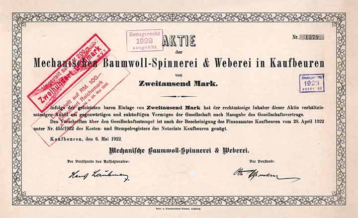 | Previous lot | Back | Next lot | | Lot: | 413 (Deutschland) | | Title: | Mechanische Baumwoll-Spinnerei & Weberei | | Details: | Aktie 2.000 Mark 6.5.1922 (Auflage 600, R 7). | Starting price: | 80,00 EUR | Issuing- date: | 06.05.1922 | Issuing- place: | Kaufbeuren | | Picture: |  | | Number: | 1270 | | Info: | Gründung bereits 1838, AG seit 1858. Begünstigt durch die Wasserkraft an der Iller mit zwei Turbinen blühte der Betrieb immer weiter auf, in der Spitze waren fast 2.000 Webstühle installiert. 1882 Übernahme der früheren Sandholzschen Baumwollespinnerei u. Weberei in Kempten. 1950 Umfirmierung in “Th. Momm & Co. Baumwollspinnerei und Weberei AG” (das AR-Mitglied Herbert W. Momm war Teilhaber beim Bankhaus Delbrück von der Heydt & Co., Köln), 1954-56 Bau eines eigenen Wasserkraftwerkes an der Wertach, 1957/59 zweiter Weberei-Neubau. 1971 Umfirmierung in “Spinnerei und Weberei Momm AG”, seit 1976 per Beherrschungs- und Gewinnabführungsvertrag an die Spinnerei und Weberei Pfersee, Augsburg gebunden. Mit Traumdividenden von 50 % die Errtragsperle des Pfersee-Kolbermoor-Konzerns. In den 1990er Jahren in eine KG umgewandelt. | | Specials: | Großes Querformat mit dekorativer Blattranken-Umrahmung. Lochentwertet (RB). | | Availability: | Doppelblatt. (R 7) | | Condition: | VF | | Sold: | unsold |