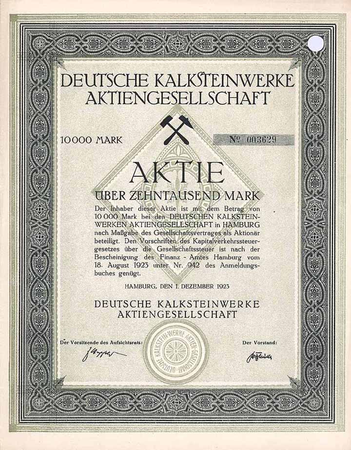 | Previous lot | Back | Next lot | | Lot: | 82 (Deutschland) | | Title: | Deutsche Kalksteinwerke AG | | Details: | Aktie 10.000 Mark 1.12.1923. Gründeraktie (Auflage 5000, R 8). | Starting price: | 40,00 EUR | Issuing- date: | 01.12.1923 | Issuing- place: | Hamburg | | Picture: |  | | Number: | 3659 | | Info: | Gründung 1923. Betrieb von Kalksteinbrüchen, Herstellung von Bau- und Hochofen-Kalk, Handel mit Bergwerksprodukten. 1924 Sitzverlegung nach Düsseldorf. | | Specials: | Lochentwertet (RB). | | Availability: | Mit kpl. anhängenden Kupons. (R 8) | | Condition: | EF | | Sold: | unsold |